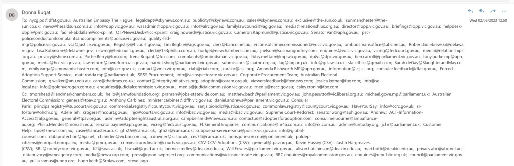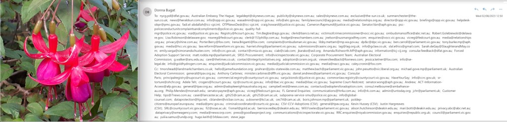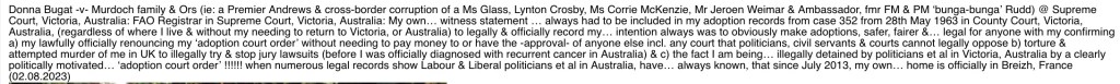 Donna Bugat -v- Murdoch family & Ors (ie: a Premier Andrews & cross-border corruption of a Ms Glass, Lynton Crosby, Ms Corrie McKenzie, Mr Jeroen Weimar & Ambassador, fmr FM & PM ‘bunga-bunga’ Rudd) @ Supreme Court, Victoria, Australia: FAO Registrar in Supreme Court, Victoria, Australia: My own… witness statement … always had to be included in my adoption records from case 352 from 28th May 1963 in County Court, Victoria, Australia, (regardless of where I live & without my needing to return to Victoria, or Australia) to legally & officially record my… intention always was to obviously make adoptions, safer, fairer &… legal for anyone with my confirming a) my lawfully officially renouncing my ‘adoption court order’ without needing to pay money to or have the -approval- of anyone else incl. any court that politicians, civil servants & courts cannot legally oppose b) torture & attempted murder of me in UK to illegally try & stop jury lawsuits (before I was officially diagnosed with recurrent cancer in Australia) & c) the fact I am being… illegally detained by politicians et al in Victoria, Australia by a clearly politically motivated… ‘adoption court order’ !!!!!! when numerous legal records show Labour & Liberal politicians et al in Australia, have… always known, that since July 2013, my own… home is officially in Breizh, France (02.08.2023)