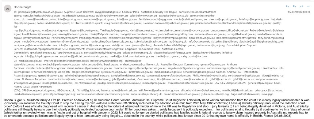 Donna Bugat -v- Murdoch family & Ors (ie: Premier Andrews et al) @ Supreme Court, Victoria, Australia: Re: Supreme Court Registrar: I obviously need written confirmation from the court it is clearly legally unsustainable & was -obviously- unlawful for the County Court to stop me having my own -witness statement- !!!! officially included in my adoption case 352, from 28th May 1963 confirming I have a) lawfully officially renounced the ‘adoption court order’ (before I was officially diagnosed with recurrent cancer in Australia) b) the torture & attempted murder of me in the UK was to illegally try and stop… jury lawsuits c) I am being illegally detained in Victoria, and Australia by politicians still illegally trying to use their clearly politically motivated ‘adoption court order’ !!!! for goodness sakes… solely because it is politically expedient… for politicians et al to illegally try & continue to live in a ‘state of denial’ (which further unraveled when I was in first in and out of hospital with cancer in 2022 & it could no longer be denied politicians had falsified state & federal records to falsely claim I owned property in Australia (so records had to be amended) because politicians are illegally trying to hide I am actually being illegally… detained in the country, while politicians had known since 2013 that my own home is officially in Breizh, France (03.08.2023)