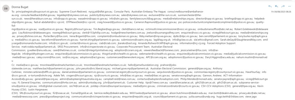 Donna Bugat -v- Murdoch family & Ors (ie: Premier Andrews & undeclared ‘conflicts of interest’ by fmr Cmmwth AG & Chair of VicHealth Ms Roxon & a Professor & fmr Family Court Judge Mushin with political spin of phoney ‘apology’ in 2013) @ Supreme Court, Victoria, Australia: FAO: Supreme Court Registrar: The politicians et al illegally stopping my own -witness statement- !!!! being officially included on court record on 21st December 2021 (before I was officially diagnosed with recurrent cancer in Australia) in… my own adoption case 352 from 28th May 1963 (which is a continuation of unlawful attempts by Murdoch family -who had trafficked me to intelligence services- to try and stop… jury lawsuits in UK) that has only happened because it is… politically expedient for politicians et al (because I confirmed a) I have officially renounced ‘adoption court order’ I did not need to pay money to or ridiculously have approval from anyone else, incl a court to do b) torture & attempted murder of me happened in UK to illegally try & avoid jury lawsuits c) I am being unlawfully detained by politicians in Australia based on a clearly… political & unlawful ‘adoption court order’ !!!! I have already officially renounced while politicians have known my own home since 2013 is officially in Breizh, France) is not… legally sustainable and does in fact & law bring administration of justice into serious disrepute (04.08.2023)