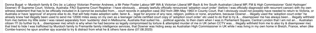 Donna Bugat -v- Murdoch family & Ors (ie: a Labour Victorian Premier Andrews, a Mr Peter Foster Labour MP WA & Victorian Liberal MP Bach & fmr South Australian Liberal MP, FM & High Commissioner ‘Gold Hydrogen’ Downer) @ Supreme Court, Victoria, Australia: FAO Supreme Court Registrar: I have obviously… already lawfully officially renounced ‘adoption court order’ (before I was officially diagnosed with recurrent cancer) with my own witness statement that has to be officially included in & cannot be excluded from… court records in adoption case 352 from 28th May 1963 in County Court, that I obviously could not possibly have needed to return to Victoria, or Australia or have ‘approval’ of anyone else to do, that will help make adoption safer, fairer &… legal for anyone of any race, religion, politics or none, anywhere, because Downer… illegally used the ‘adoption court order’ he already knew had illegally been used to send me 12000 miles away on my own as a teenager (while certified court copy of ‘adoption court order’ etc used to do that to try &… disempower me has always been… illegally withheld from me) before my little sister I was raised separately from ’suddenly’ died in Melbourne, Australia that suited his… political agenda, to then claim when I was in Parliament Square, Central London that I am not an… Australian citizen !!!! (to further try &… disempower me) which is why when he had become so legally compromised by torture & attempted murder of me in UK (when CCTV was… illegally withheld from me to also try & disempower me) that tried to hide I was trafficked by Murdoch family to Fremantle family intelligence services, that Downer was hiding away as Australian High Commissioner in UK while I was living in my own home in Breizh, France, when (like Combe-Ivanov) he spun another spy scandal to try & distract from what he & others have done (07.08.2023)