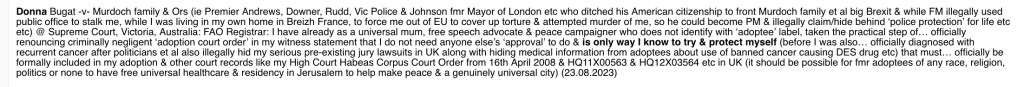 Donna Bugat -v- Murdoch family & Ors (ie Premier Andrews, Downer, Rudd, Vic Police & Johnson fmr Mayor of London etc who ditched his American citizenship to front Murdoch family et al big Brexit & while FM illegally used public office to stalk me, while I was living in my own home in Breizh France, to force me out of EU to cover up torture & attempted murder of me, so he could become PM & illegally claim/hide behind ‘police protection’ for life etc etc) @ Supreme Court, Victoria, Australia: FAO Registrar: I have already as a universal mum, free speech advocate & peace campaigner who does not identify with ‘adoptee’ label, taken the practical step of… officially renouncing criminally negligent ‘adoption court order’ in my witness statement that I do not need anyone else’s ‘approval’ to do & is only way I know to try & protect myself (before I was also… officially diagnosed with recurrent cancer after politicians et al also illegally hid my serious pre-existing jury lawsuits in UK along with hiding medical information from adoptees about use of banned cancer causing DES drug etc) that must… officially be formally included in my adoption & other court records like my High Court Habeas Corpus Court Order from 16th April 2008 & HQ11X00563 & HQ12X03564 etc in UK (it should be possible for fmr adoptees of any race, religion, politics or none to have free universal healthcare & residency in Jerusalem to help make peace & a genuinely universal city) (23.08.2023)