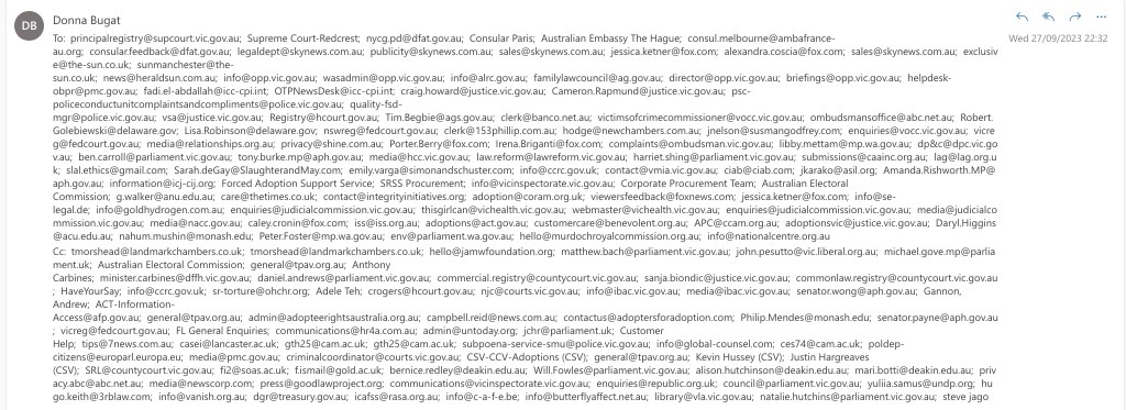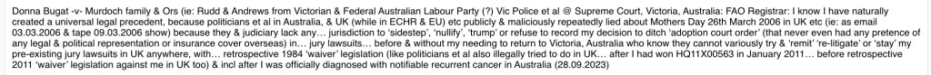 Donna Bugat -v- Murdoch family & Ors (ie: Rudd & Andrews from Victorian & Federal Australian Labour Party (?) Vic Police et al @ Supreme Court, Victoria, Australia: FAO Registrar: I know I have naturally created a universal legal precedent, because politicians et al in Australia, & UK (while in ECHR & EU) etc publicly & maliciously repeatedly lied about Mothers Day 26th March 2006 in UK etc (ie: as email 03.03.2006 & tape 09.03.2006 show) because they & judiciary lack any… jurisdiction to ‘sidestep’, ‘nullify’, ‘trump’ or refuse to record my decision to ditch ‘adoption court order’ (that never even had any pretence of any legal & political representation or insurance cover overseas) in… jury lawsuits… before & without my needing to return to Victoria, Australia who know they cannot variously try & ‘remit’ ‘re-litigate’ or ‘stay’ my pre-existing jury lawsuits in UK anywhere, with… retrospective 1984 ‘waiver’ legislation (like politicians et al also illegally tried to do in UK… after I had won HQ11X00563 in January 2011… before retrospective 2011 ‘waiver’ legislation against me in UK too) & incl after I was officially diagnosed with notifiable recurrent cancer in Australia (28.09.2023)