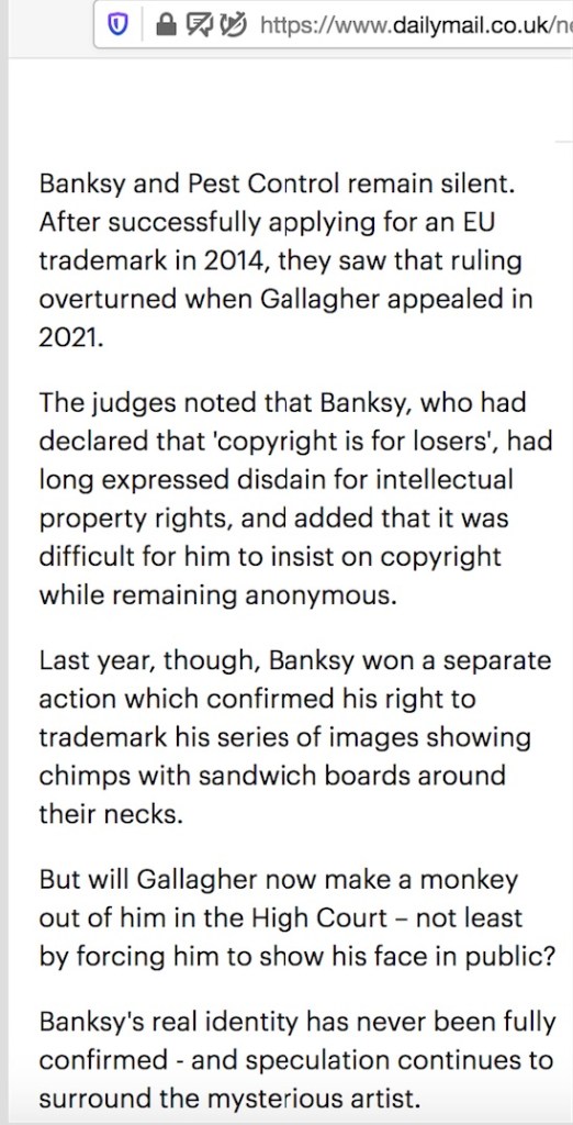 I also made my own… decision in the UK in the High Court in October 2011 that was accepted, when I ordered the Banksy’s that were taken on 23rd May 2006 (when I was also unlawfully arrested so politicians could publish whatever they liked because I could not get an injunction to stop them doing that) be returned to the artist (so he could do whatever he wanted with them) which Johnson and New Scotland Yard did do because they were actually involved in HQ11X00563 too.