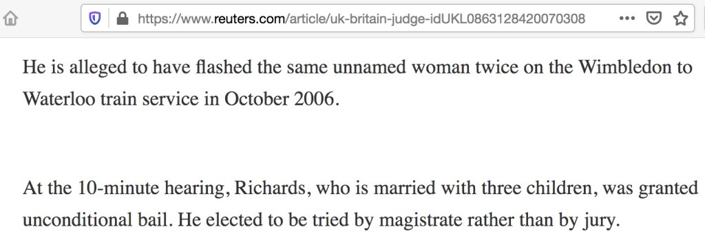 I refused to dignify sitting in the High Court with the original judge, Lord Justice ‘Flasher’ Richards in our Contempt of Court case, because he had a conflict of interest because he was on trial himself at the same time in Westminster Magistrates Court before the at that time, senior District Judge Timothy Workman. Workman found the complainant against Lord Justice ‘Flasher’ Richards must have been ‘mistaken’ about his ‘identity’ so there was a reasonable suspicion that at that time there was a deal done between the politicians and courts to cover up all sorts of ‘professional’ embarrassment.