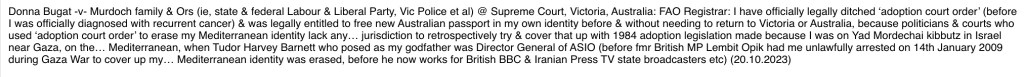 Donna Bugat -v- Murdoch family & Ors (ie, state & federal Labour & Liberal Party, Vic Police et al) @ Supreme Court, Victoria, Australia: FAO Registrar: I have officially legally ditched ‘adoption court order’ (before I was officially diagnosed with recurrent cancer) & was legally entitled to free new Australian passport in my own identity before & without needing to return to Victoria or Australia, because politicians & courts who used ‘adoption court order’ to erase my Mediterranean identity lack any… jurisdiction to retrospectively try & cover that up with 1984 adoption legislation made because I was on Yad Mordechai kibbutz in Israel near Gaza, on the… Mediterranean, when Tudor Harvey Barnett who posed as my godfather was Director General of ASIO (before fmr British MP Lembit Opik had me unlawfully arrested on 14th January 2009 during Gaza War to cover up my… Mediterranean identity was erased, before he now works for British BBC & Iranian Press TV state broadcasters etc) (20.10.2023)