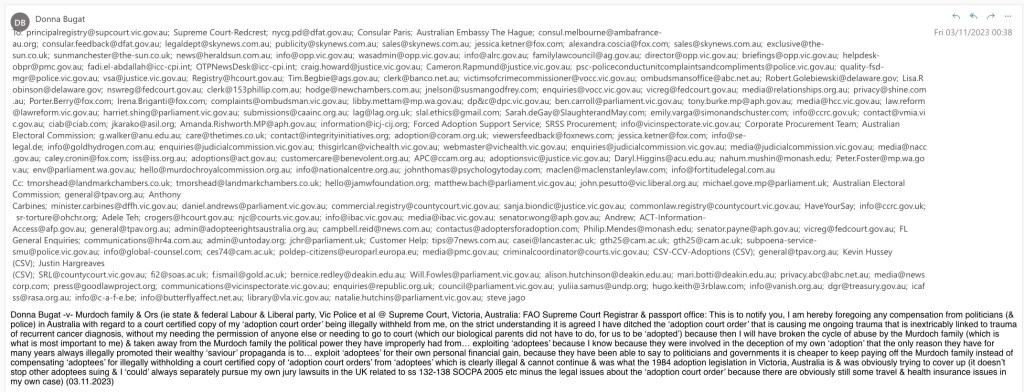 Donna Bugat -v- Murdoch family & Ors (ie state & federal Labour & Liberal party, Vic Police et al @ Supreme Court, Victoria, Australia: FAO Supreme Court Registrar & passport office: This is to notify you, I am hereby foregoing any compensation from politicians (& police) in Australia with regard to a court certified copy of my ‘adoption court order’ being illegally withheld from me, on the strict understanding it is agreed I have ditched the ‘adoption court order’ that is causing me ongoing trauma that is inextricably linked to trauma of recurrent cancer diagnosis, without my needing the permission of anyone else or needing to go to court (which our biological parents did not have to do, for us to be ‘adopted’) because then I will have broken the cycle of abuse by the Murdoch family (which is what is most important to me) & taken away from the Murdoch family the political power they have improperly had from… exploiting ‘adoptees’ because I know because they were involved in the deception of my own ‘adoption’ that the only reason they have for many years always illegally promoted their wealthy ‘saviour’ propaganda is to… exploit ‘adoptees’ for their own personal financial gain, because they have been able to say to politicians and governments it is cheaper to keep paying off the Murdoch family instead of compensating ‘adoptees’ for illegally withholding a court certified copy of ‘adoption court orders’ from ‘adoptees’ which is clearly illegal & cannot continue & was what the 1984 adoption legislation in Victoria, Australia is & was obviously trying to cover up (it doesn’t stop other adoptees suing & I ‘could’ always separately pursue my own jury lawsuits in the UK related to ss 132-138 SOCPA 2005 etc minus the legal issues about the ‘adoption court order’ because there are obviously still some travel & health insurance issues in my own case) (03.11.2023)