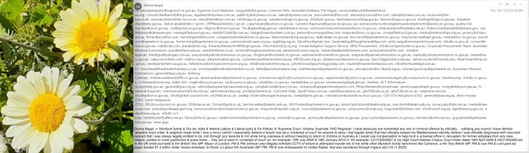Donna Bugat -v- Murdoch family & Ors (ie: state & federal Labour & Liberal party & Vic Police) @ Supreme Court, Victoria, Australia: FAO Registrar: I have obviously not committed any civil or criminal offence by officially… notifying any court/s I have ditched ‘adoption court order’ & adoption made while I was a minor (which I reasonably believe it would now be a ‘contempt of court’ for anyone to deny I had legally done) that had officially erased my Mediterranean identity (before I was officially diagnosed with recurrent cancer) that I was always legally entitled to do, incl through jury lawsuits & incl while living overseas & without needing to return to Victoria or Australia & I would use compensation to help fund a universal office in Jerusalem for former adoptees from any race, religion, politics or none (politicians & press knew… they are & were in ‘contempt of court’ on -for example- 19th July 2009 & 16th January 2012 in -for example- CO11393/2007 & my High Court Habeas Corpus Court Order dated 16th April 2008 & HQ11X00563 etc in the UK while journalist & fmr British Tory MP, Mayor of London, FM & PM Johnson also illegally withheld CCTV of torture & attempted murder etc of me while other Murdoch family henchmen like Cameron, a fmr Tory British MP, PM & now FM & Lord paid tax payer funded $1.4 billion dollar ‘brown envelope’ to Rudd, a Labour fmr Australian MP, PM, FM & now Ambassador to United States, that was laundered through Ingeus etc) (16.11.2023)