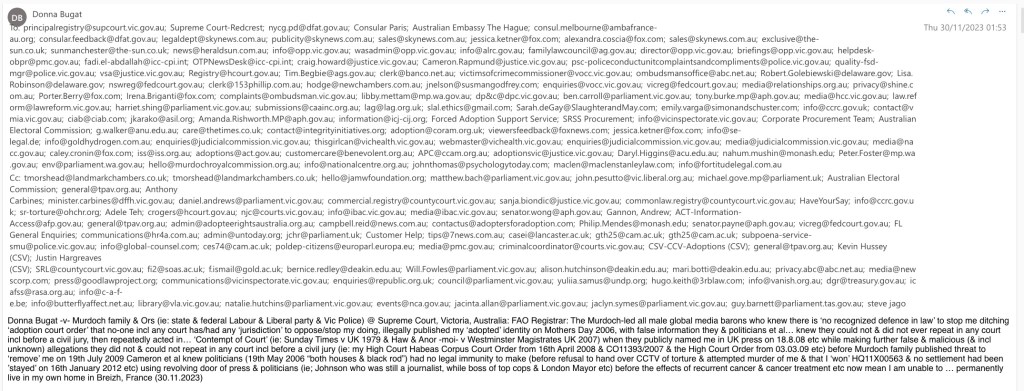 Donna Bugat -v- Murdoch family & Ors (ie: state & federal Labour & Liberal party & Vic Police) @ Supreme Court, Victoria, Australia: FAO Registrar: The Murdoch-led all male global media barons who knew there is ‘no recognized defence in law’ to stop me ditching ‘adoption court order’ that no-one incl any court has/had any ‘jurisdiction’ to oppose/stop my doing, illegally published my ‘adopted’ identity on Mothers Day 2006, with false information they & politicians et al… knew they could not & did not ever repeat in any court incl before a civil jury, then repeatedly acted in… ‘Contempt of Court’ (ie: Sunday Times v UK 1979 & Haw & Anor -moi- v Westminster Magistrates UK 2007) when they publicly named me in UK press on 18.8.08 etc while making further false & malicious (& incl unknown) allegations they did not & could not repeat in any court incl before a civil jury (ie: my High Court Habeas Corpus Court Order from 16th April 2008 & CO11393/2007 & the High Court Order from 03.03.09 etc) before Murdoch family published threat to ‘remove’ me on 19th July 2009 Cameron et al knew politicians (19th May 2006 “both houses & black rod”) had no legal immunity to make (before refusal to hand over CCTV of torture & attempted murder of me & that I ‘won’ HQ11X00563 & no settlement had been ’stayed’ on 16th January 2012 etc) using revolving door of press & politicians (ie; Johnson who was still a journalist, while boss of top cops & London Mayor etc) before the effects of recurrent cancer & cancer treatment etc now mean I am unable to … permanently live in my own home in Breizh, France (30.11.2023)