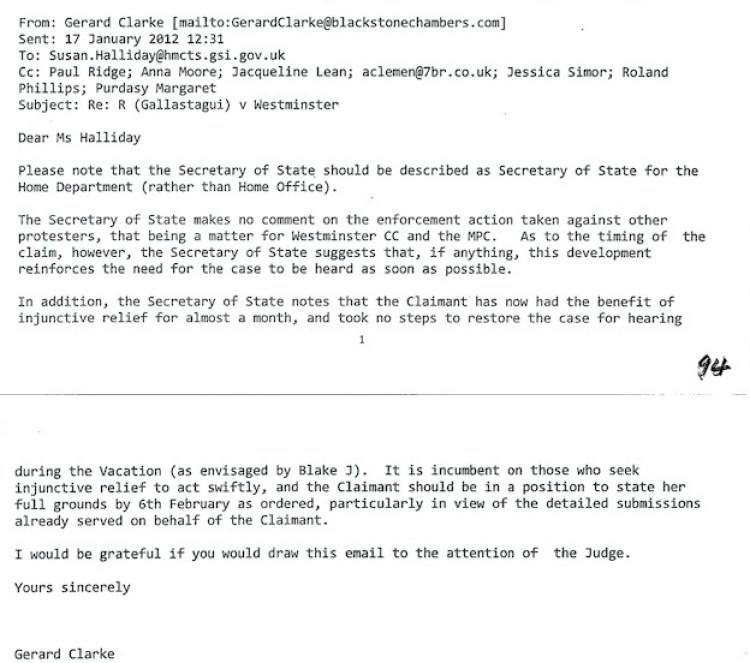 There was obviously no stay on ‘satellite litigation’ in HQ11X00563 (that I had really ‘won’ in early 2011) so the person/s named 9 & 11 could not have had any injunction protecting them that is referred to in this ‘smoking email’ below from 17th January 2012 (the people named 9 & 11 in HQ11X00563 too had essentially put “both houses and black rod” Johnson in the London Mayoralty by covering up what Livingstone also did to me while London Mayor):