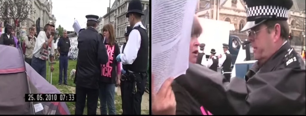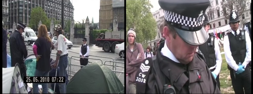 Then at 7.44 am the British Metropolitan police (“curiously”) edit their own footage (they did not know our video was still recording or what it recorded) to try and cover up that very oddly the British Metropolitan Police gave some of my personal property !!!! to Mr Bailey who I had just spent the past half an hour being filmed explaining was part of ‘Democracy Village’ I was not campaigning with: