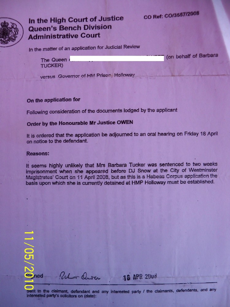 Some of the High Court Habeas Corpus Court Order paperwork (that has two different numbers) from 10th April – 16th April 20o8