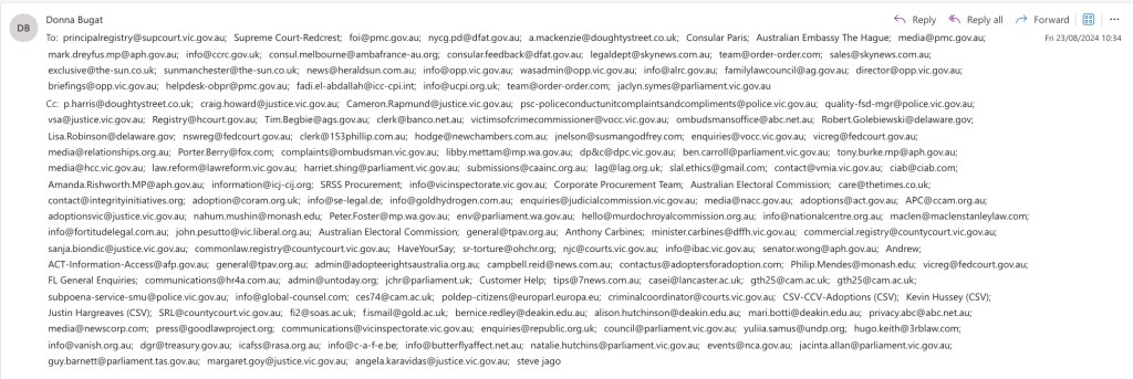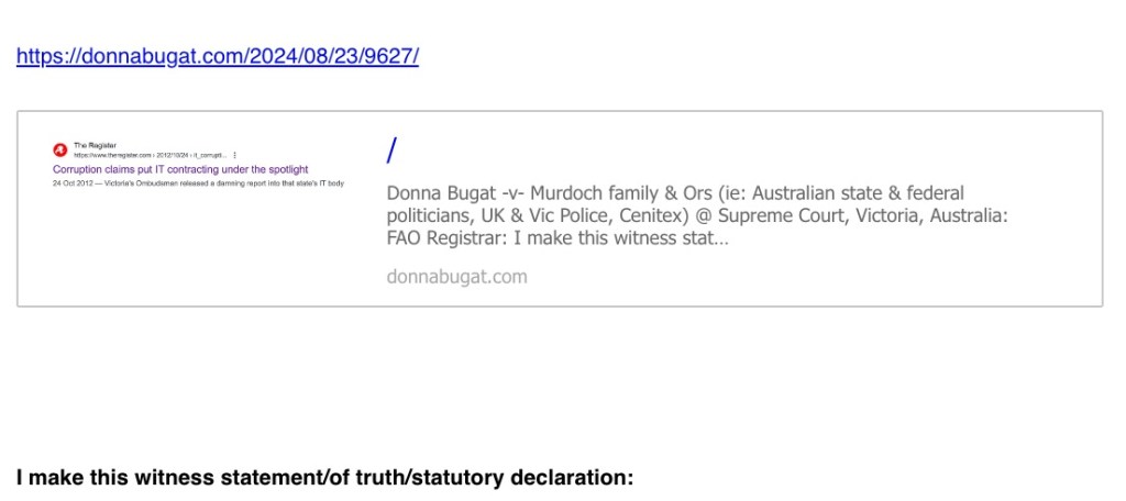 Donna Bugat -v- Murdoch family & Ors (ie: Australian state & federal politicians, UK & Vic Police, Cenitex) @ Supreme Court, Victoria, Australia: FAO Registrar: I make this witness statement/of truth/statutory declaration incl a) my ditching adoption court order from Victoria, Australia in my UK lawsuit/s by -video- without my needing to physically appear in any court/return to UK (& could incl via Australian embassy in London, UK/Paris, France etc) & b) to incl legally binding agreement in UK lawsuit/s that I could not be & was not lawfully arrested, prosecuted, convicted or imprisoned by British Magistrates, because it is unlawful for British Judiciary to be judges/adjudicators in their own case/s where they remain legally liable etc for refusing to make audio/audio visual recordings of my proceedings in British Magistrates Courts, to avoid completely foreseeable disputes about conduct of Judiciary first ‘case stated’ by a lawyer on 24th February 2006 that resulted in Judiciary illegally repeatedly denying me legal representation in -all- courts c) Murdoch family cease & desist with publishing adoption misinformation/propaganda globally & pay me financial compensation for ‘trial by media’ of me in UK where they incited what resulted in torture & (attempted) murder etc of me with CCTV illegally withheld (23.08.2024)