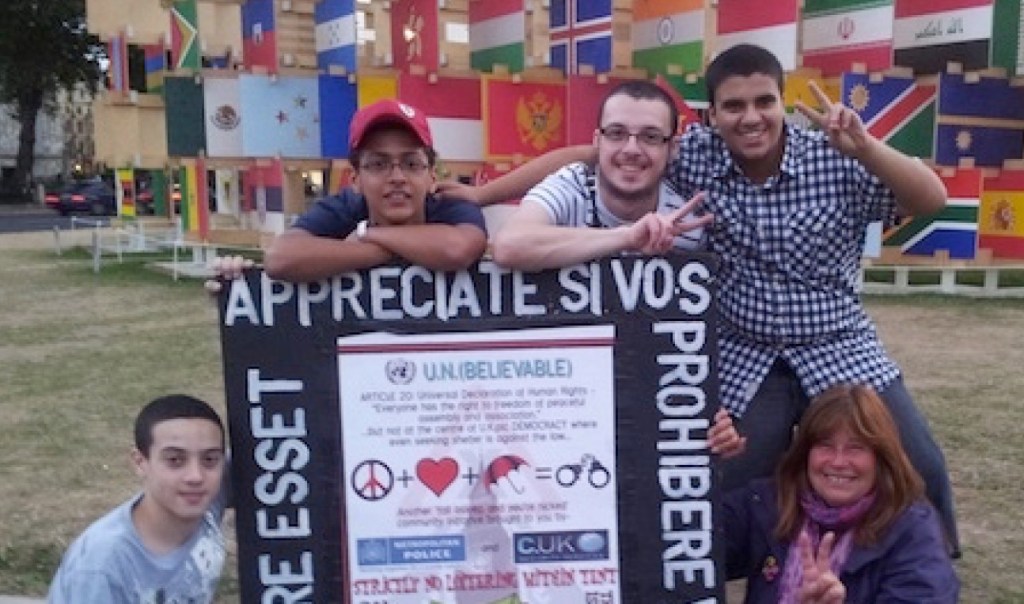 In the UK, I really was as an adult, unlawfully arrested for publicly “inciting”… ummm… “Peace, Love & Justice For All” while accompanied by a fellow campaigner Steve Jago, which isn’t really the democracy the British ‘constitutional monarchy’ claim to be. The British government illegally destroyed every version I ever made of that banner. The word they most seemed to hate was the word… all.