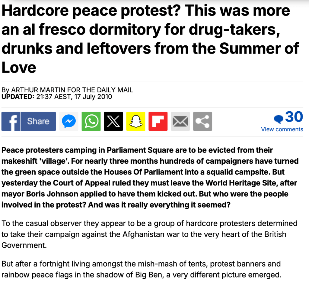 The government had illegally stolen property again in September 2011 after Brian died and they did the whole routine of they could behave as though they were entitled to run our campaign, and so they decided who ‘owned’ what !! They illegally went through legally privileged information (and not for the first time) in live legal proceedings and then stashed the property in the City of London Museum of London so no-one could be accused of having stolen anything, although it was stolen by the government because neither Brian or I ever gave them permission to have anything. I would like everything returned from the Museum of London who are just telling the same old story which is basically some ‘eccentric’ guy did a protest. Another state actor called Sir Mark Rylance popped up and claimed he was a good friend of Brian’s to spin a statue outside the War Museum. We’d never seen the guy in all the years there. There were three Mark’s because the original Mark was the comedian Mark Thomas who Brian did know. The Metropolitan Police loved Thomas because he provided the top Cop Blair with the excuse to provide an -undated- delegated authority saying he could basically pass the buck to other police (while he was illegally withholding the 19 May 2006 document until after 3rd March 2009)