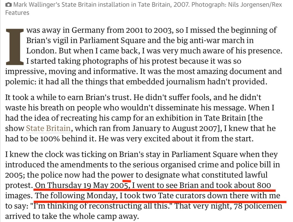 The Guardian newspaper and Wallinger didn’t waste any time when Brian died (after a major operation in a hospital in Bremen, Germany, not Berlin as is publicly claimed by the press) by putting out a puzzling story they would never dare repeat in any court. I realised because of the lies that Wallinger told, that he and a Lord Myner had while he (Myner) was Chair of the Guardian Media Group, Tate Britain and a Director at the Bank of England been paid to do the State Britain rip-off to illegally try and cover up the abuse of process, including that the document dated 19 May had been illegally withheld until after 3rd March 2009 in CO/11393/2007.