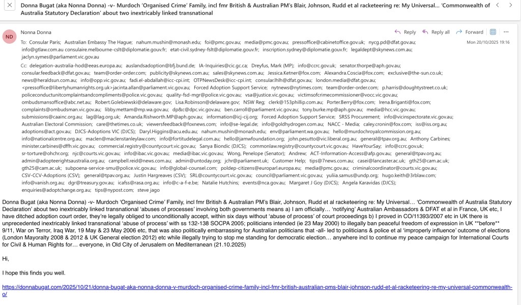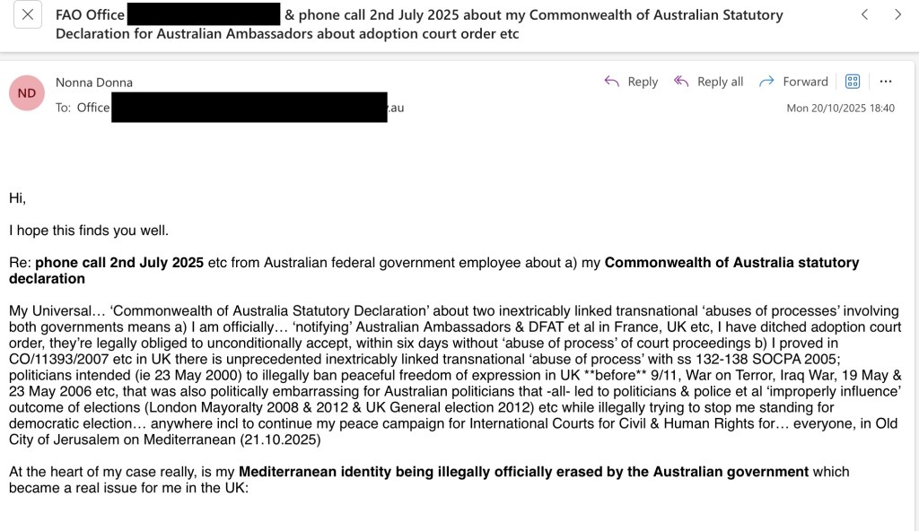 My Universal… ‘Commonwealth of Australia Statutory Declaration’ about two inextricably linked transnational ‘abuses of processes’ involving both governments means a) I am officially… ‘notifying’ Australian Ambassadors & DFAT et al in France, UK etc, I have ditched adoption court order, they’re legally obliged to unconditionally accept, within six days without ‘abuse of process’ of court proceedings b) I proved in CO/11393/2007 etc in UK there is unprecedented inextricably linked transnational ‘abuse of process’ with ss 132-138 SOCPA 2005; politicians intended (ie 23 May 2000) to illegally ban peaceful freedom of expression in UK **before** 9/11, War on Terror, Iraq War, 19 May & 23 May 2006 etc, that was also politically embarrassing for Australian politicians that -all- led to politicians & police et al ‘improperly influence’ outcome of elections (London Mayoralty 2008 & 2012 & UK General election 2012) etc while illegally trying to stop me standing for democratic election… anywhere incl to continue my peace campaign for International Courts for Civil & Human Rights for… everyone, in Old City of Jerusalem on Mediterranean (21.10.2025)