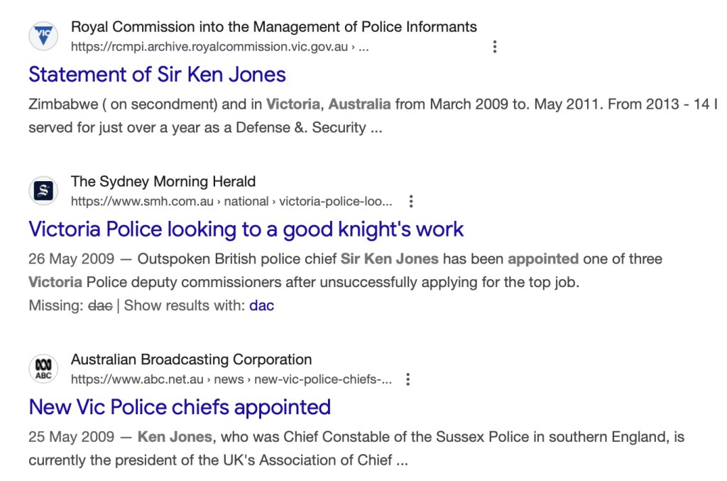 Sir Ken Jones was obviously illegally employed by politicians at Victoria Police to cover up/illegally ‘overtake’ CO/11393/2007 in the UK: