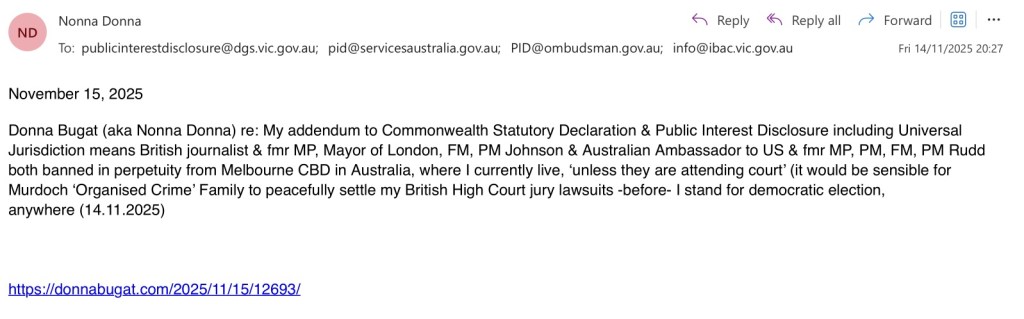 It should also be remembered they both sought to permanently ban me from having the same freedom they had to stand for election in politics, anywhere. And it was Victoria Police who had an undeclared conflict of interest when they did illegally ban me from peacefully being in or going to -any- court in the Melbourne CBD on 21st December 2021, not least since I was legally entitled to go to -any- court in the Melbourne CBD for numerous reasons. It was then a Ms Corrie McKenzie who was Rudd’s former Deputy Chief of Staff, who while she was in the DOJ in Victoria, and I was seriously ill with cancer (the first time) contacted me on 7th September 2022, specifically because she didn’t want me to have… legal representation because of her own undeclared conflict of interest. Ms Corrie MacKenzie is a political appointee not a civil servant.