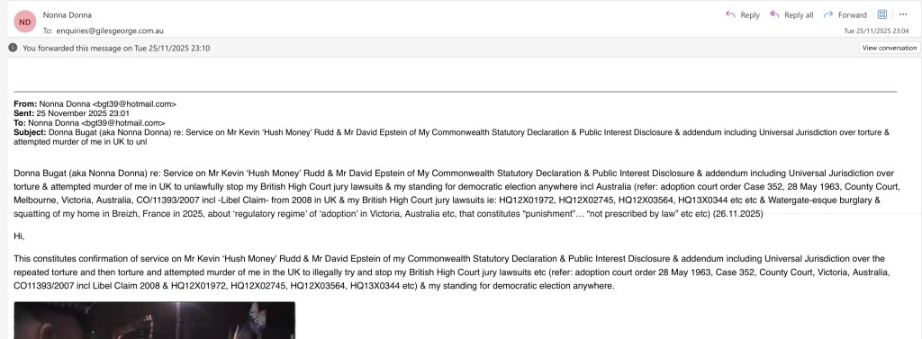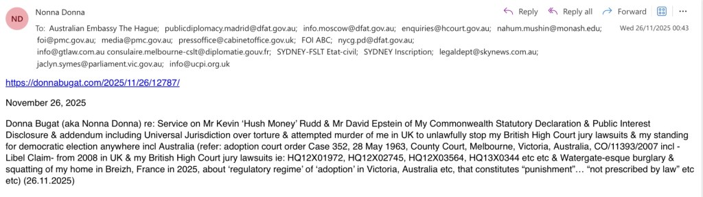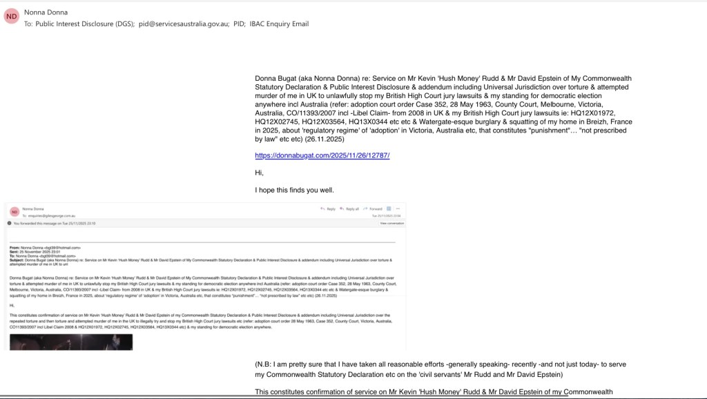 This constitutes confirmation of service on Mr Kevin ‘Hush Money’ Rudd & Mr David Epstein of my Commonwealth Statutory Declaration & Public Interest Disclosure & addendum including Universal Jurisdiction over the repeated torture and then torture and attempted murder of me in the UK to illegally try and stop my British High Court jury lawsuits etc (refer: adoption court order 28 May 1963, Case 352, County Court, Victoria, Australia, CO11393/2007 incl Libel Claim 2008 & HQ12X01972, HQ12X02745, HQ12X03564, HQ13X0344 etc) & my standing for democratic election anywhere.