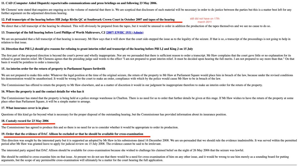 Brian and I were illegally held for thirty hours, so the Mayor of London Johnson could go running to the High Court to invent something against us -before- we were released and were able put the actual footage from 25th May 2010 in our… CO/11393/2007.