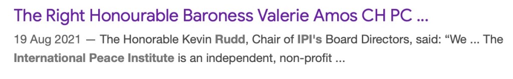 (I think it is highly unlikely that anything Rudd has done could be called an independent ‘non-profit) There was the increasing use from the Blair era onwards of unelected peers from the British House of Lords (that Blair ‘reformed’ to increase the ability of corruption to flourish) as Ministers despite their having no public constituency. A Baroness Amos was another one who was a Minister and British Ambassador to Australia (when both governments were illegally covering up the torture and attempted murder of me in the UK) before she joined Rudd at an International Institute of Peace which was as ridiculous as Blair being a Middle East Peace Envoy. The ‘International Institute of Peace’ looks like another organisation that recycles money from governments through the same old “jobs for mates” clubs when they are no longer elected. A Baroness Scotland was another person who while in the unelected Lords, became a government Minister and Attorney General (before also becoming a Secretary General of the far from Commonwealth)