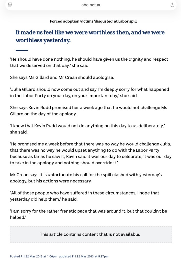 The former Australian PM’s Rudd & Gillard are not going to go to court to argue that ‘forced adoption’ is a legally recognised term, so they are disrespectful and tone-deaf, towards very serious legal issues involving adoptees.