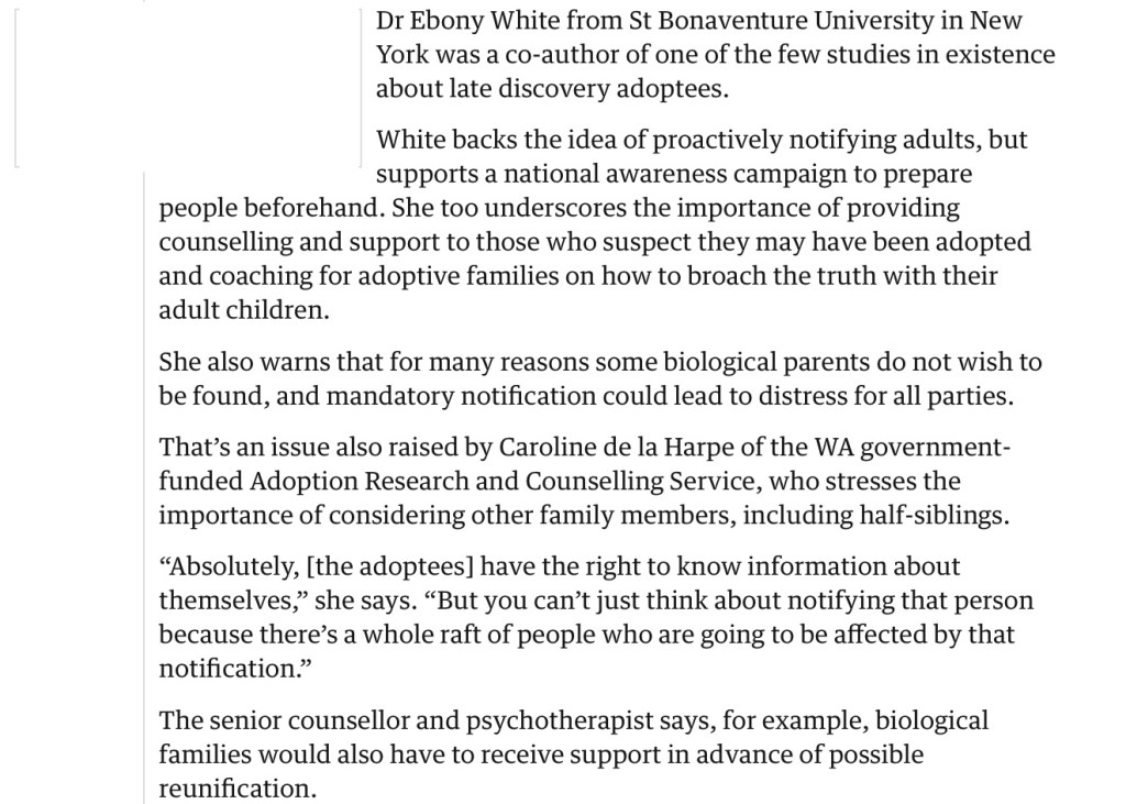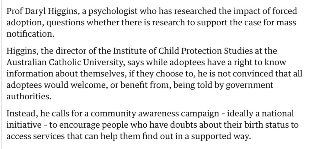 There are unfortunately cynical political and media narratives that irresponsibly try and continue to use all sorts of emotional blackmail on people made adoptees as minors to try and stop our as adults pursuing -legal avenues- against… government about legally unworkable ‘regulatory regimes’ about adoption.