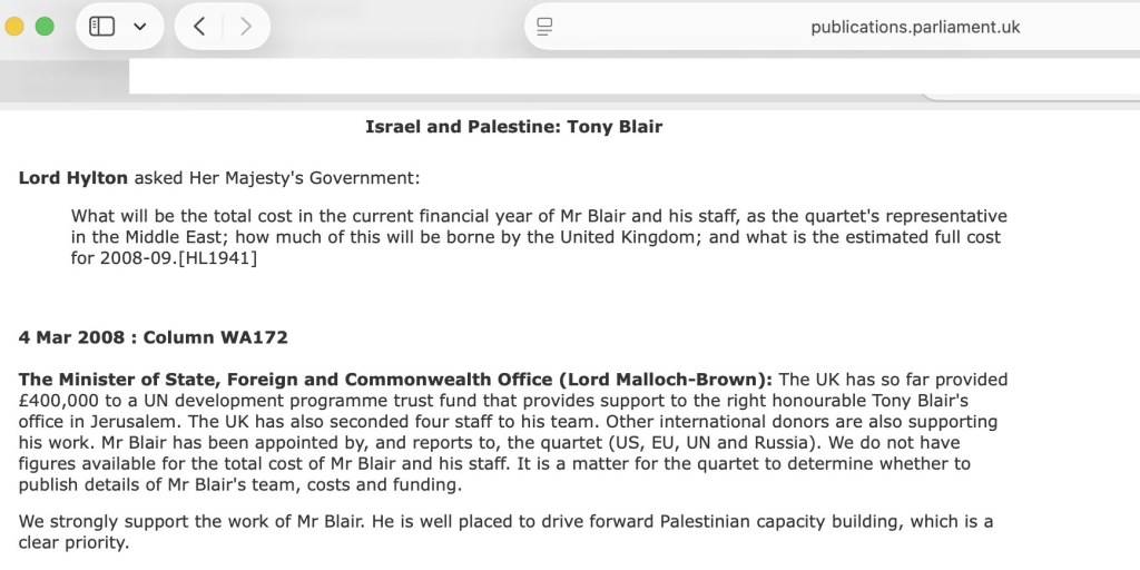 The revolving doors of ‘jobs for mates’ posing as some kind of politics that is incompatible with the peace and harmony of the rule of law and democracy, saw the British public continue to pay for Blair to grandstand as the Middle East Peace Envoy in the same way the revolving doors of ‘jobs for mates’ saw the next British PM Brown appoint a Lord Malloch Brown as a peer (and unelected Lord for hire) as a government… minister who had no members of the public in any constituency of his either:
